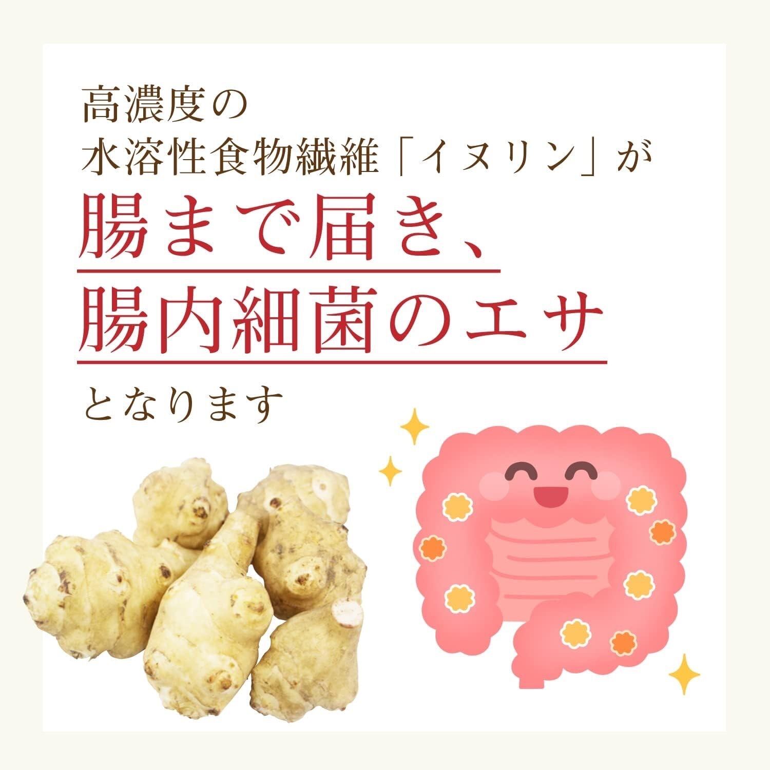 多量に摂取することによってより疾患が治癒したり、より健康が増進するものではありません。摂り過ぎあるいは体質、体調によりお腹が緩くなることがあります。原料表示をご確認の上、食物アレルギーのある方は接種をお控えください。原料である菊芋の菊芋の収穫期により製品の色や風味が異なる場合がありますが、使用されている原料由来のものですので品質には問題ありません。